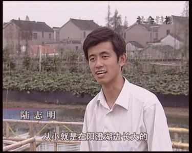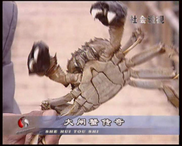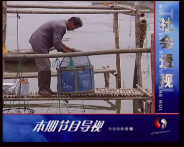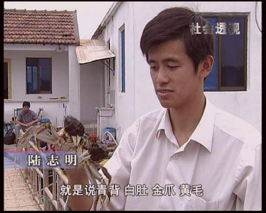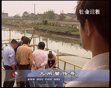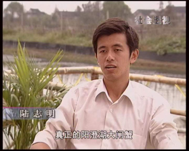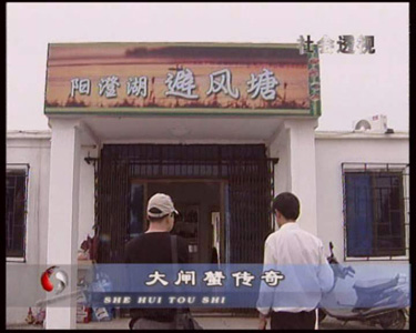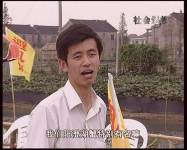 | 2005年10月,北京电视台《社会透视》栏目组拍摄阳澄湖地区大闸蟹养殖、销售情况,采访了苏州阳澄湖大闸蟹行业协会会长杨维龙先生、销售公司、养殖户等。下面为栏目组采访本蟹庄的图象。 |